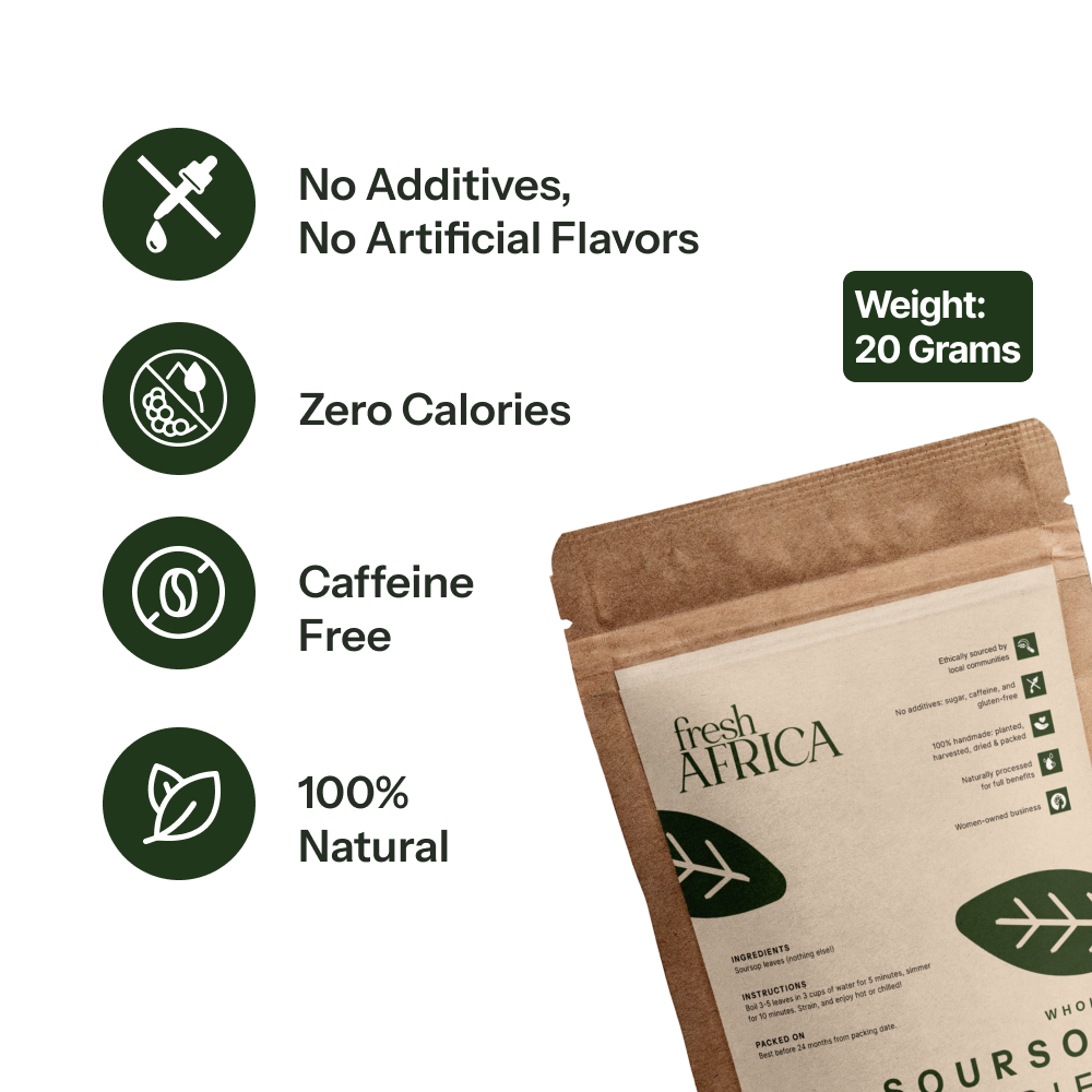 Perfect for those seeking wellness in a cup, Fresh Africa’s Soursop Tea leaves come in convenient, resealable 20-gram bags to ensure freshness in every use. Embrace the purity of nature and enjoy the goodness of ethically sourced, premium tea leaves.