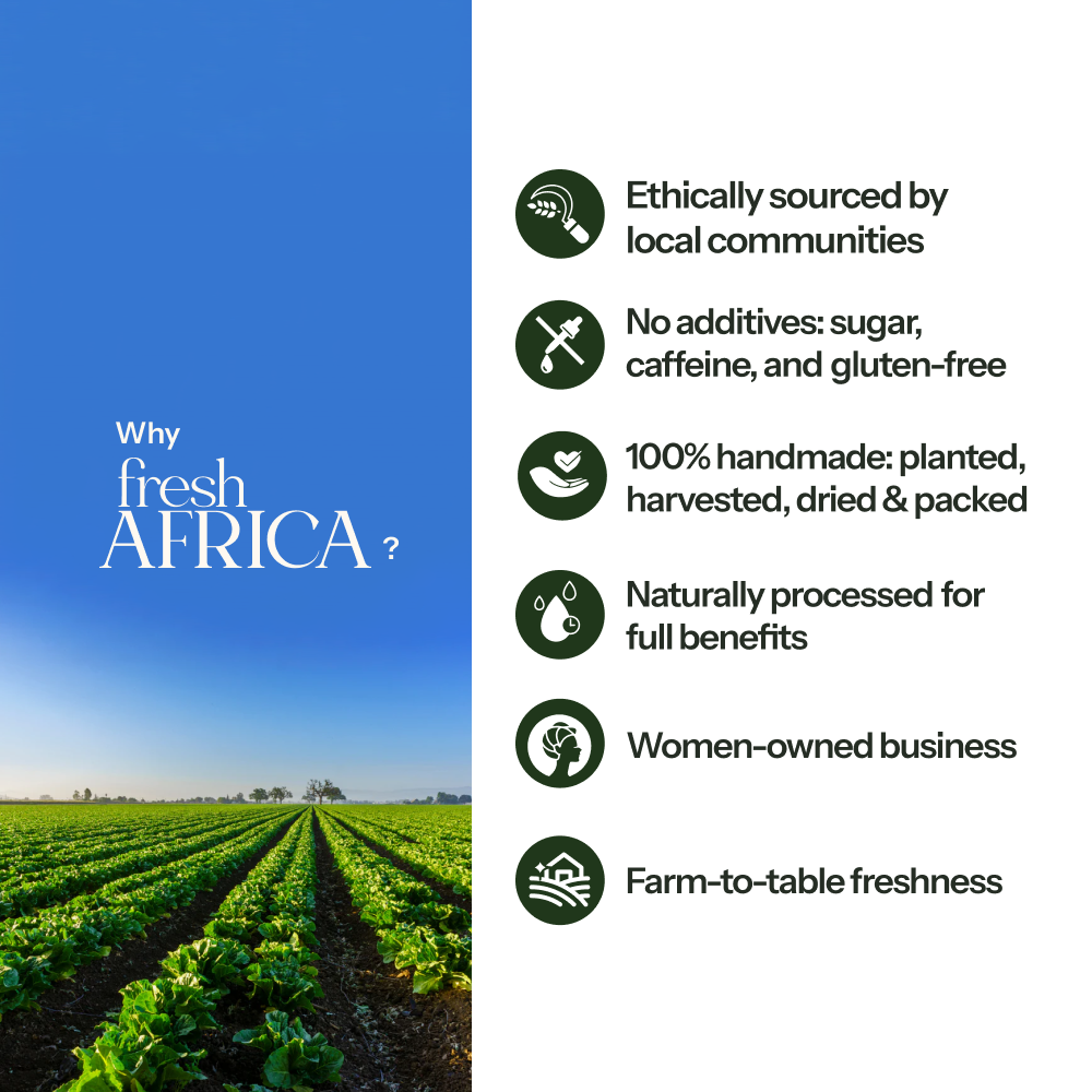 Discover the power of nature in every sip with Fresh Africa’s premium Soursop Tea leaves. Handpicked and shade-dried for maximum flavor and potency, our tea leaves are ethically sourced from farms across Africa.